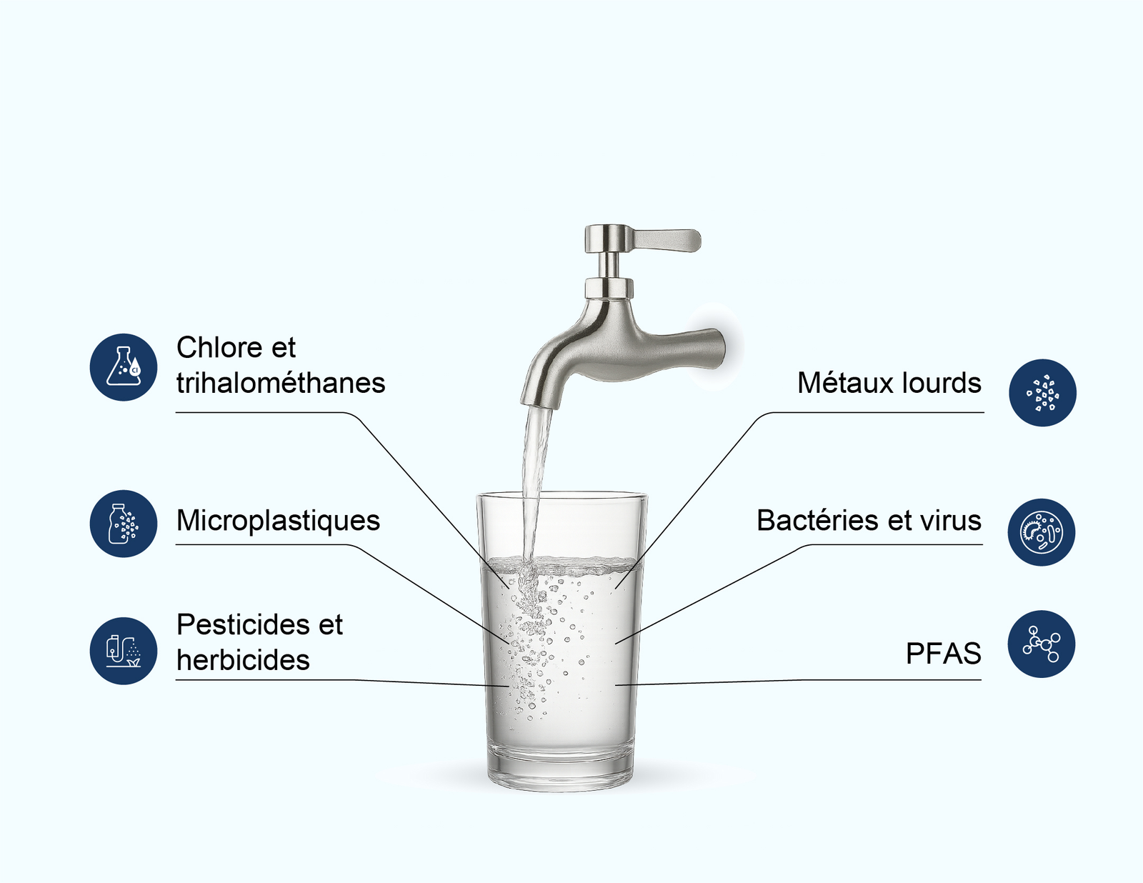 Chaque gorgée d’eau du robinet non filtrée peut contenir des substances nocives présentant de graves risques pour la santé. Du chlore aux microplastiques, en passant par les bactéries et les polluants éternels, ces contaminants sont souvent invisibles — mais bien réels.