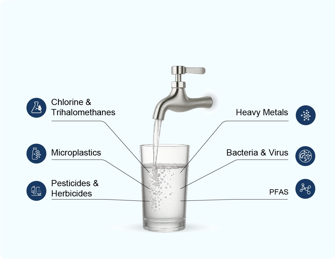 Every sip of unfiltered tap water may contain harmful substances that pose serious health risks. From chlorine and microplastics to bacteria and forever chemicals, these contaminants are often invisible – but they’re real.